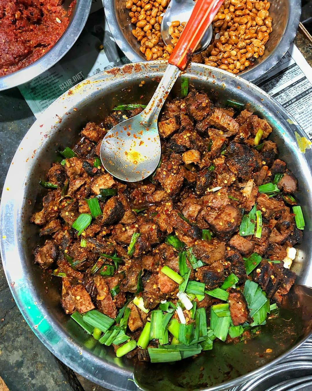 Choila, also known as Choyla, is a traditional and special delicacy of the Newar community, made from spiced and grilled buffalo meat. Although traditionally prepared using buffalo meat, it is now also made with mutton, chicken, duck, and even mushrooms. This dish is typically eaten with beaten rice (chiura) and is generally very spicy.